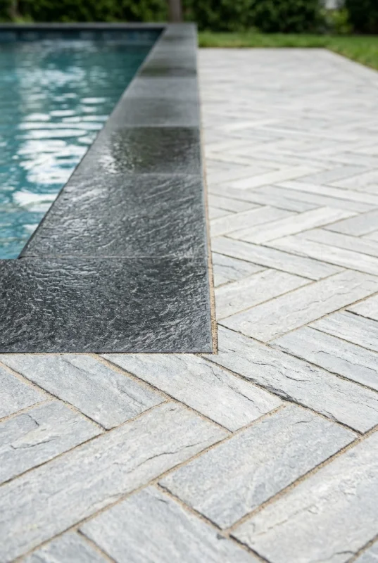 The finished edge between the pool shell and surrounding deck. A major visual detail that sets the tone for the whole backyard.