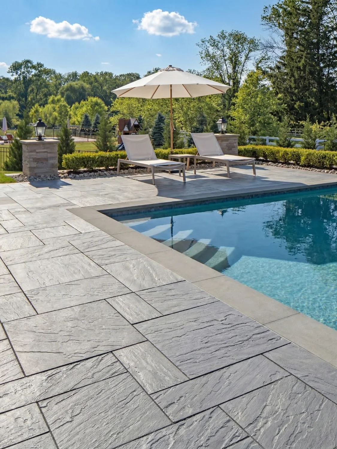 Poured concrete is one solid surface. If it cracks or shifts, repair is difficult. Paving stone is made up of individual units set on a prepared base, so any damaged piece can be removed and replaced without disturbing the rest. Paving stone also offers far more design options and tends to look more refined around pools and patios.